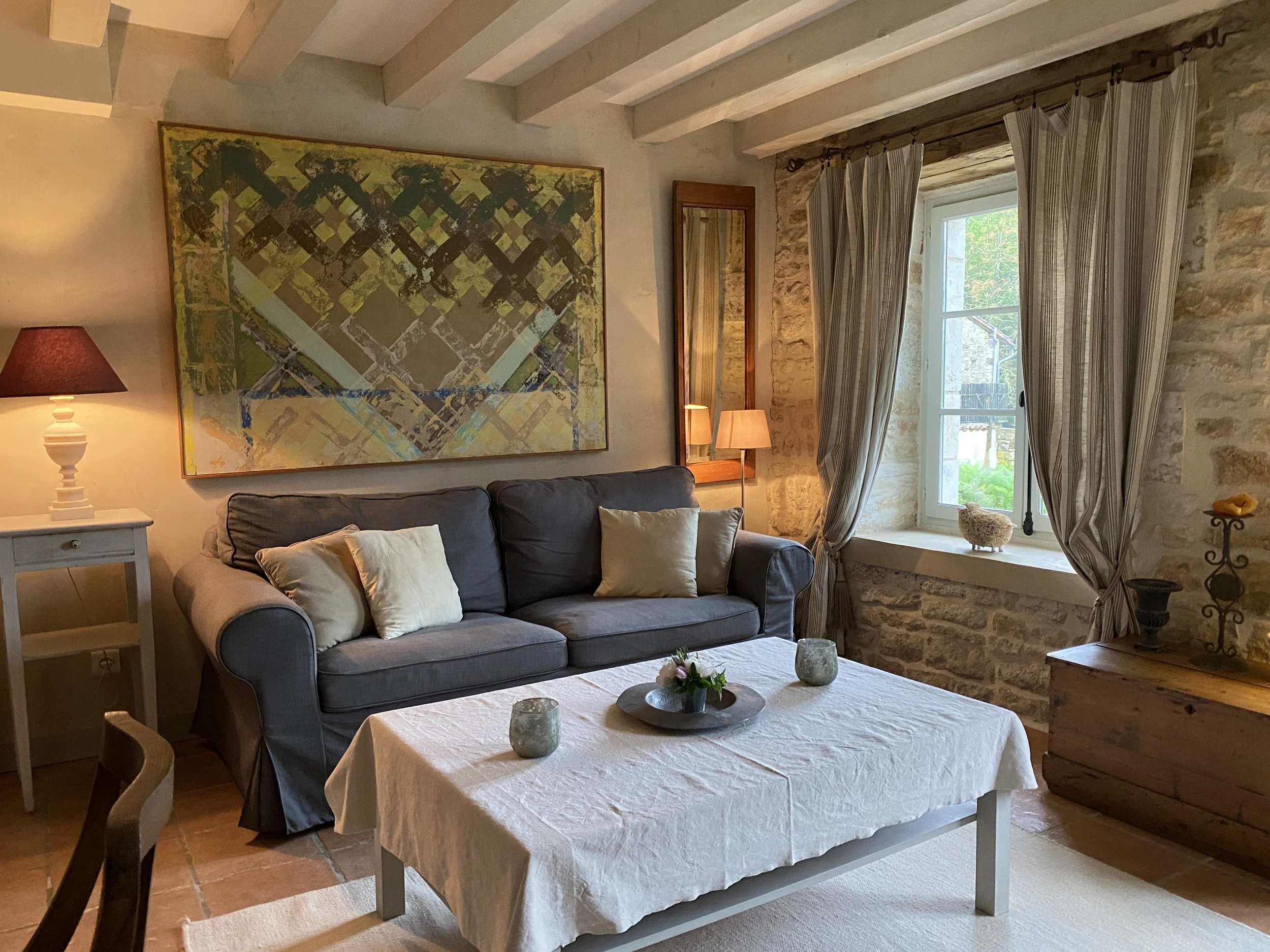 Living room - a separate 'petit salon' with French doors onto the garden with lovely views over the meadow, exposed stone walls, beams, double bed settee, superb old desk, book case and armchair - an ideal writer's retreat!