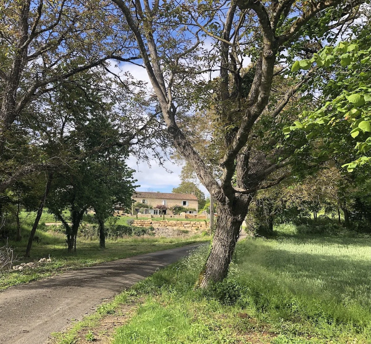 The house faces south and its front borders are planted with old fashioned, scented climbing roses and lavenders. The garden is walled to one side with iron entrance gates and a gravel driveway to the parking area. There is a small sunken herb garden inspired by the Carolingian gardens of the region and a wonderful view from the lawn over the meadow, which is occasionally grazed by a handsome horse, an adorable donkey or a few sheep.