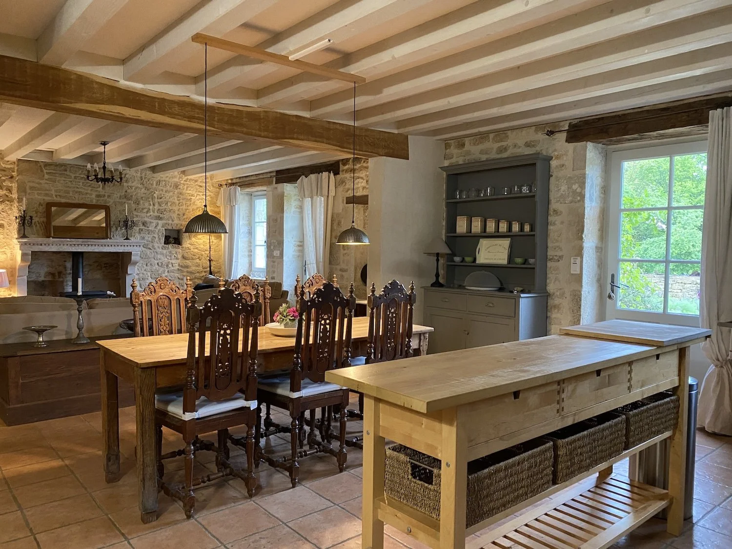 Sitting/dining room - is a large, light and airy open plan room with exposed honey coloured stone walls and painted beams. At the sitting room end there's a traditional Charentaise fireplace, two comfy settees and armchairs, a low table and a painted cupboard housing a UK Satellite TV, DVD player, and MP3 micro system with USB port. The dining area has an old refectory table, carved wooden chairs and a painted dresser.